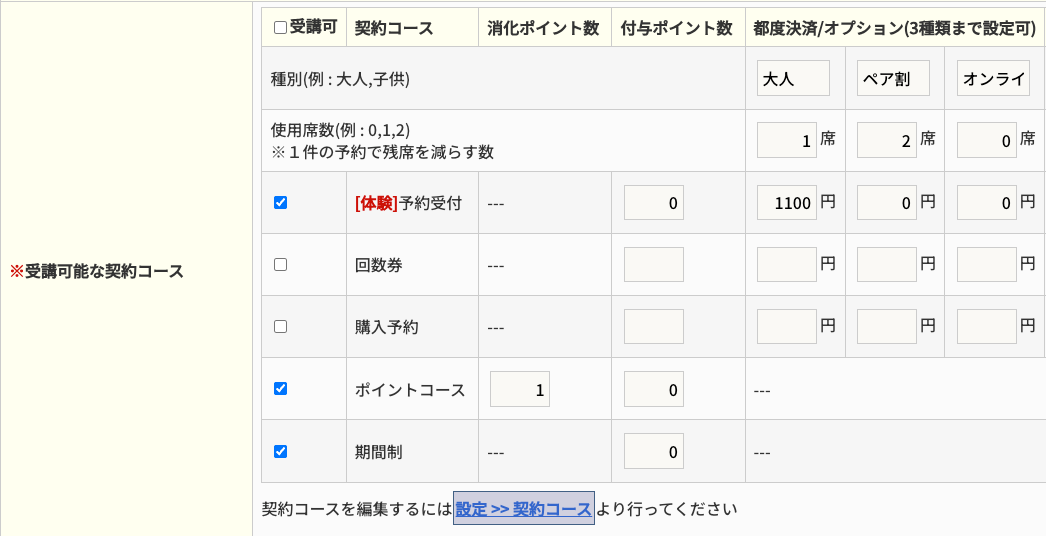 都度決済 タイプが回数券・都度決済の契約コースの場合は予約にかかる料金とその種別および使用席数を設定します。料金種別は3種まで登録可能です。回数券の場合は回数券1枚と差額決済としたり、割引価格が適用できる割引券として運用できます