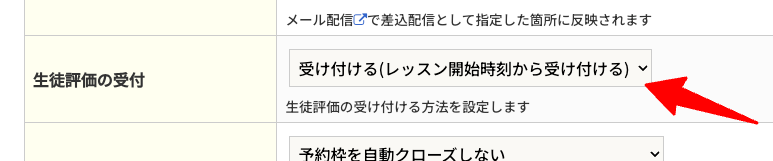 生徒評価の受付タイミングにレッスン開始時刻からが追加になりました View Larger Image 生徒評価の入力可能なタイミングの設定に「受け付ける(レッスン開始時刻から受け付ける)」が追加になりました これにより、生徒評価の受付は以下のようになりました 受け付ける(レッスン終了時刻から受け付ける) 受け付ける(レッスン開始時刻から受け付ける) 受け付ける(レッスン実施前でも受け付ける) 受け付けない レッスンごとに生徒評価の受付タイミングを切り替えることでより柔軟な運用が可能となりました wada2026-04-14T17:55:49+09:003月 30th, 2026|機能追加| SNSにシェアする FacebookXLinkedInPinterest Related Posts メール送信エラーが検知された表示を追加しました Gallery メール送信エラーが検知された表示を追加しました 4月 8th, 2026 請求でお客様承認を取るステップを追加できるようになりました Gallery 請求でお客様承認を取るステップを追加できるようになりました 4月 7th, 2026 テーブル・所属講師に、対応性別を追加しました Gallery テーブル・所属講師に、対応性別を追加しました 4月 7th, 2026 仕様変更 ポイントチャージは、ポイント制契約が有効な期間のみに可能になります Gallery 仕様変更 ポイントチャージは、ポイント制契約が有効な期間のみに可能になります 4月 1st, 2026 時刻を指定しない。終日レッスンの予約受付に対応しました Gallery 時刻を指定しない。終日レッスンの予約受付に対応しました 3月 16th, 2026