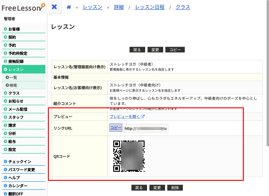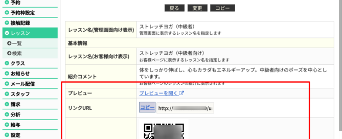 レッスンの内容確認画面に、ユーザープレビューページのリンクとURLコピーおよび、スマホで確認する際に利用しやすいQRコードを追加しました プレビューページでは予約受付期間前であってもユーザー画面での見え方を確認することができます